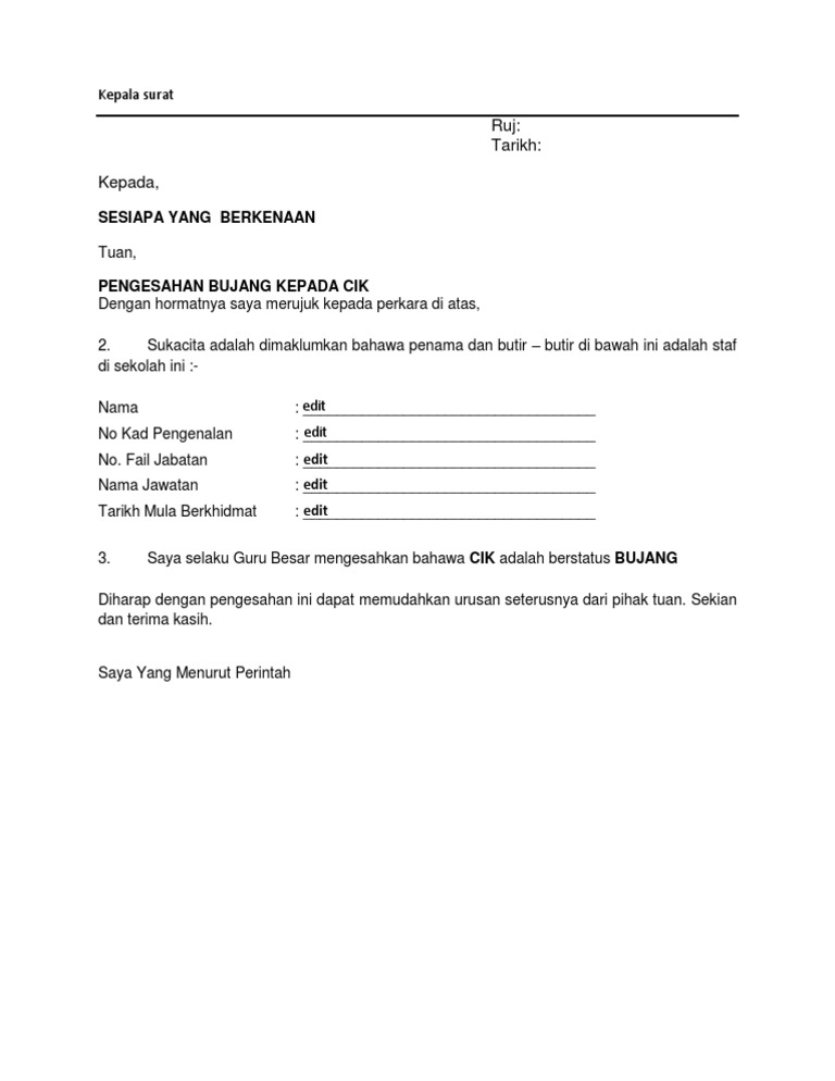 Tajuk surat mestilah ditulis dengan huruf besar kesemuanya dan dihitamkan. Status sya dlm proses penceraian.blom dapat surat cerai…bekas suami mohon bujang sbb tiada. Mar 29, 2020 · di bahagian akuan pengesahan, sila. Jun 14, 2021 · 4. Satu salinan penyata pendapatan / pencen / perkeso.